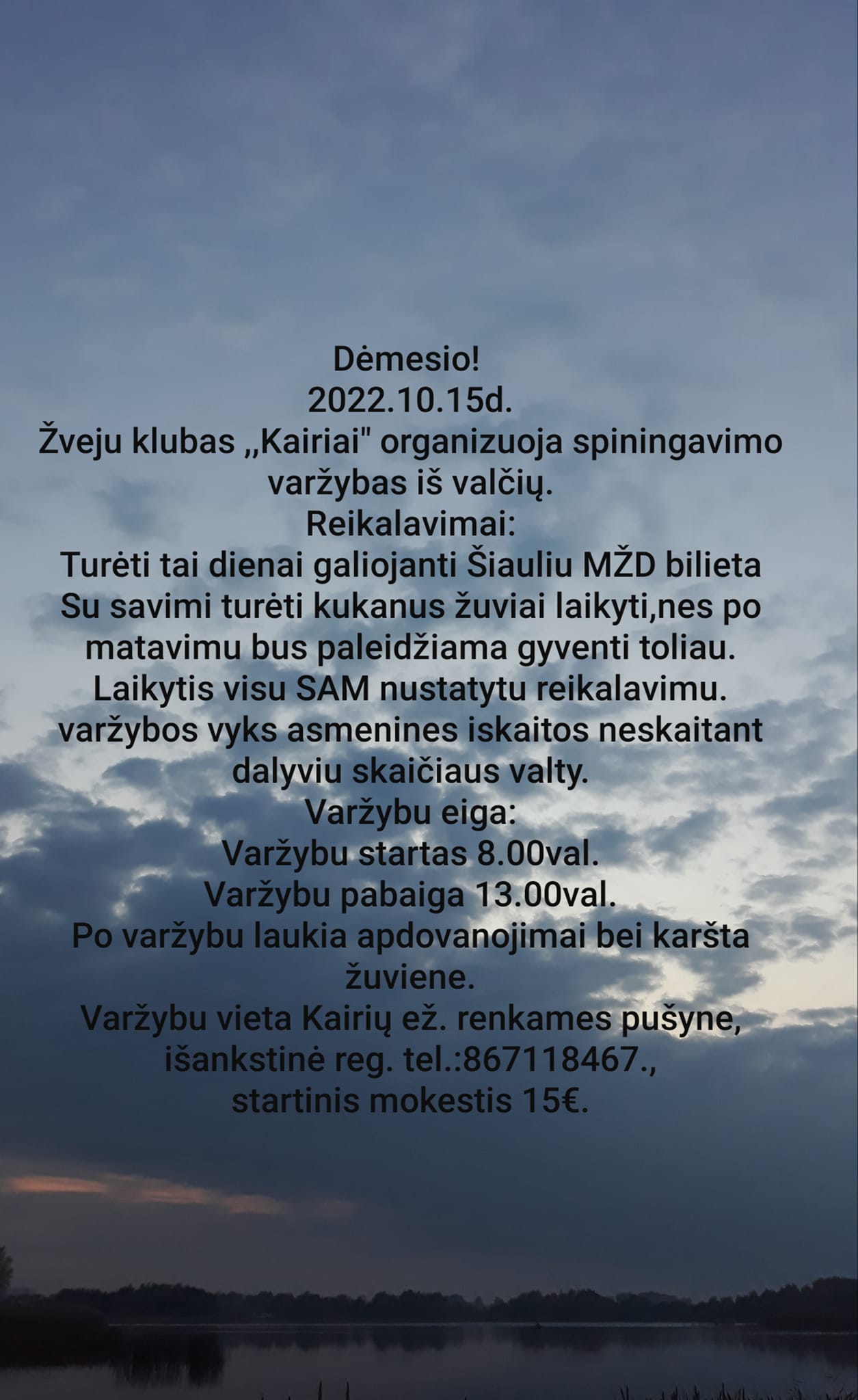 Maloniai kviečiame dalyvauti Žemaitijos sportinės žūklės lygos prezidento a.a. D.Mačiūno Taurės varžybose Platelių ežere 2022-10-08 d.