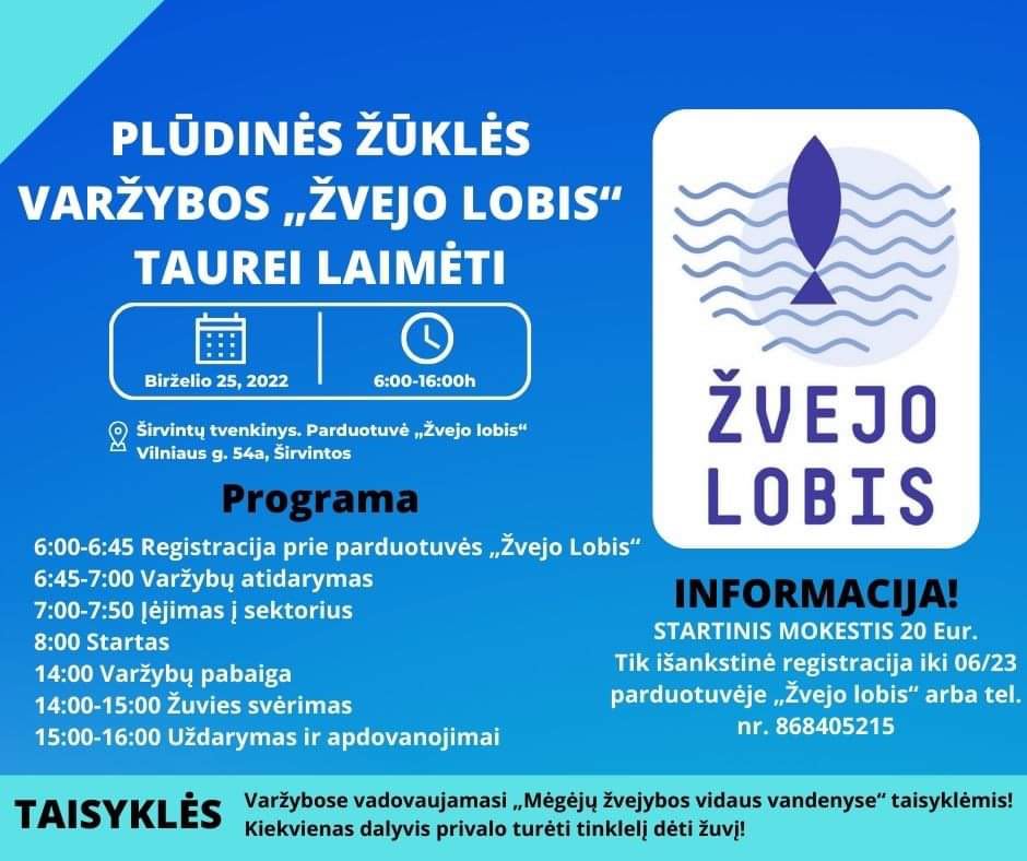 Mes ir vėl kviečiame visus žvejus į jau antrąsias plūdinės žūklės varžybas. Pažadame linksmą renginį, puikius mūsų ir rėmėjų prizus ir be abejo skanų plovą pietums. Būtina išankstinė registracija.