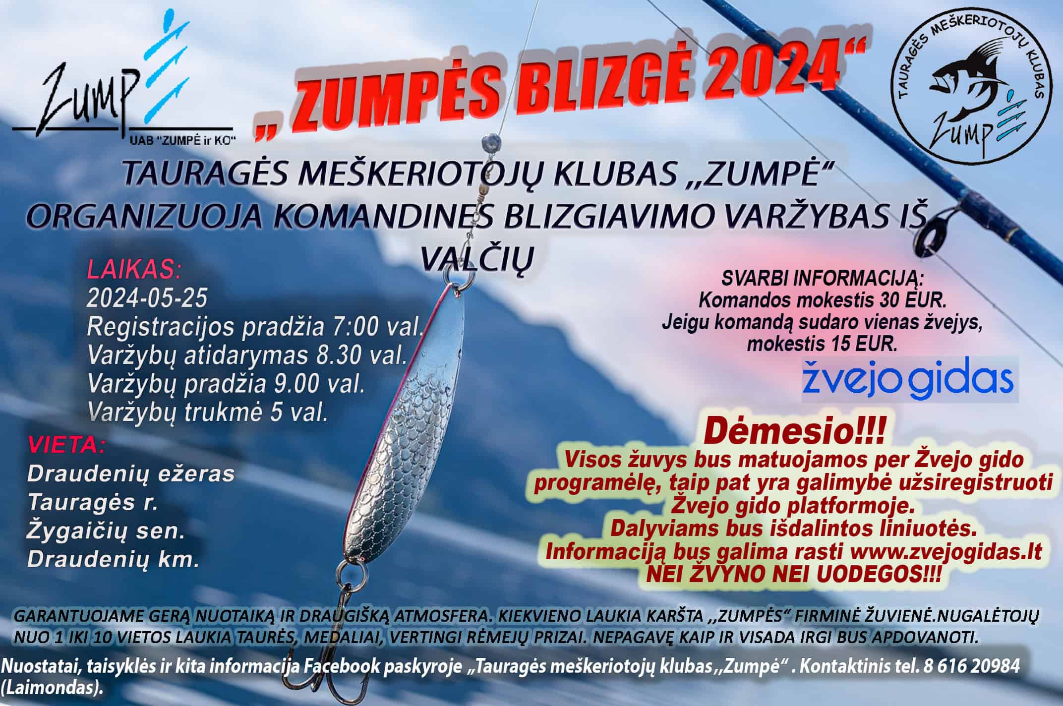 Tauragės meškeriotojų klubas "Zumpė" organizuoja blizgiavimo varžybas iš valčių. Garantuojame gerą nuotaika ir draugišką atmosferą. Kiekvieno laukia karšta „Zumpės" Šefo firminė žuvienė!